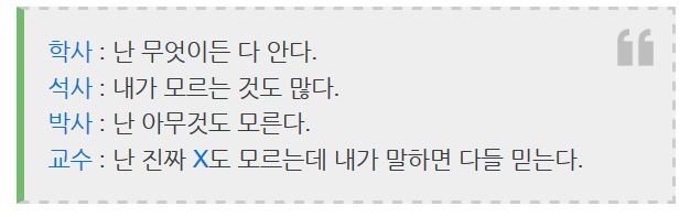 멍청한 사람은 원래 본인이 멍청한 걸 모른다고 한다. 반대로 말하면 내가 모른다는 것을 알면 지혜로워지는 것이라고 소크라테스는 말했다.