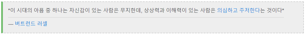 "이 시대의 아픔 중 하나는 자신감이 있는 사람은 무지한데, 상상력과 이해력이 있는 사람은 의심하고 주저한다는 것이다" — 버트런드 러셀