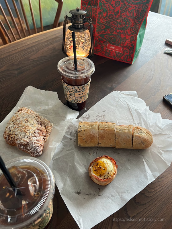 아아 3잔과 간소하게 방 몇 개를 주문해서 빈 속을 채웠다. 크리스마스 느낌의 페이즐리 종이 봉투가 취향저격이었당.