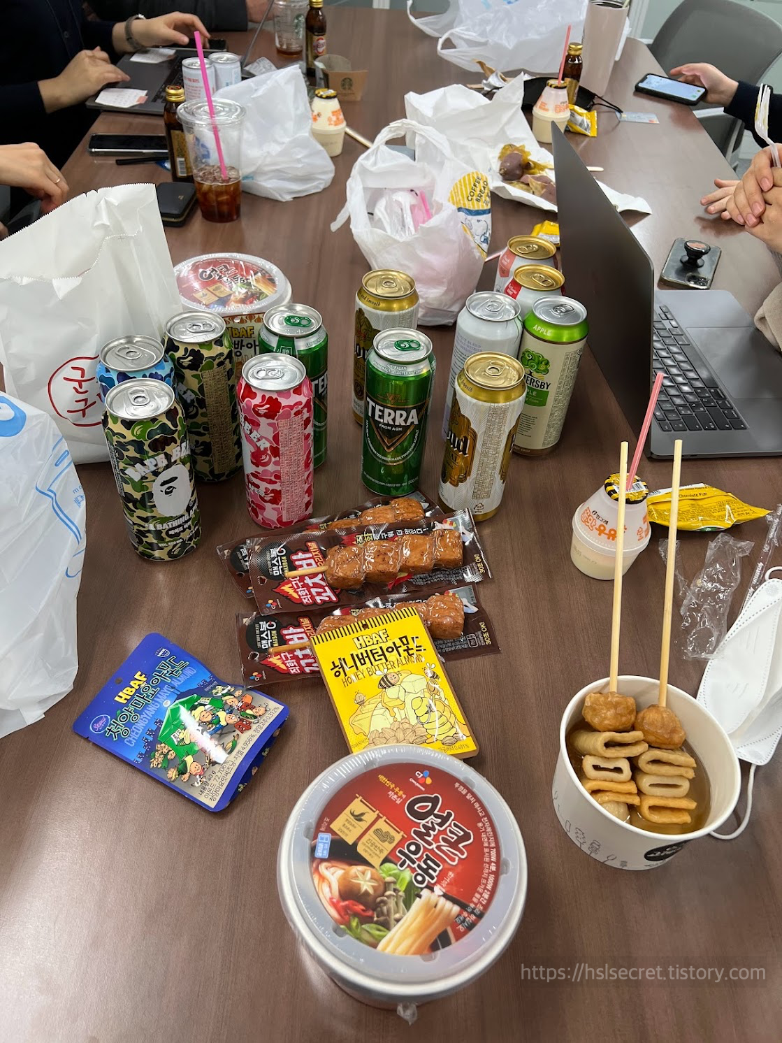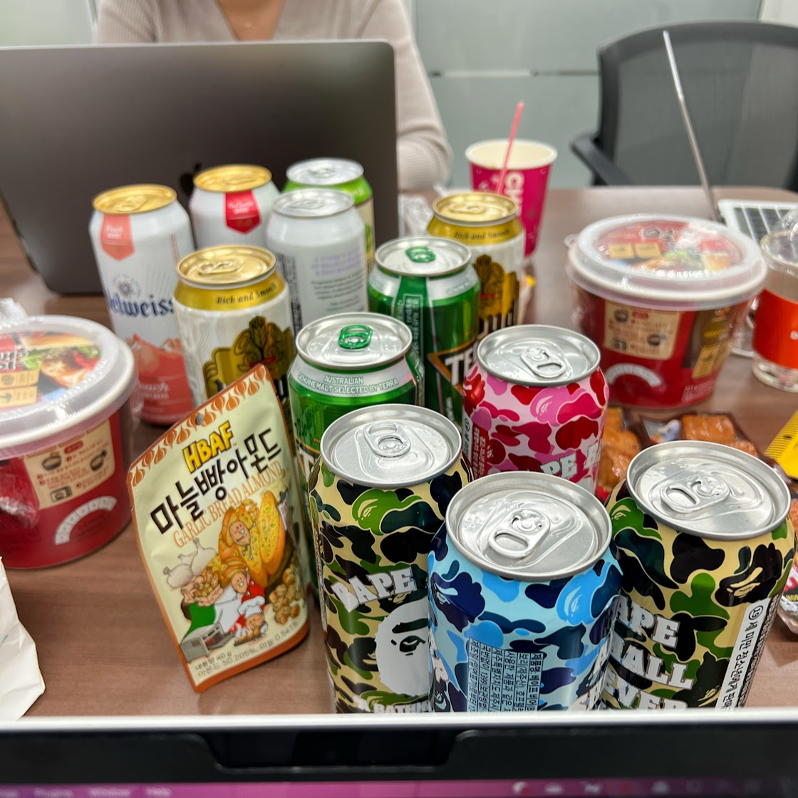 퇴근 시간이 되니 다들 당이 떨어진다며 편의점을 털어왔다. 맥주가 당섭취에 도움이 되나보다.